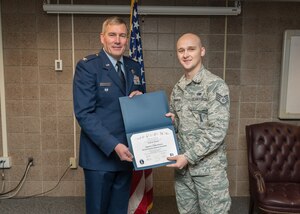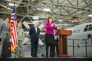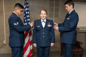 Senior Airman Mike Navarrete, left, and Captain Jason Boerboom, right, tack Chief Master Sgt. stripes onto Chief Master Sgt. Anna Bartlett, Financial Management superintendent with the 934th Airlift Wing, during a promotion ceremony Jan. 7 at Minneapolis-St. Paul International Airport Air Reserve