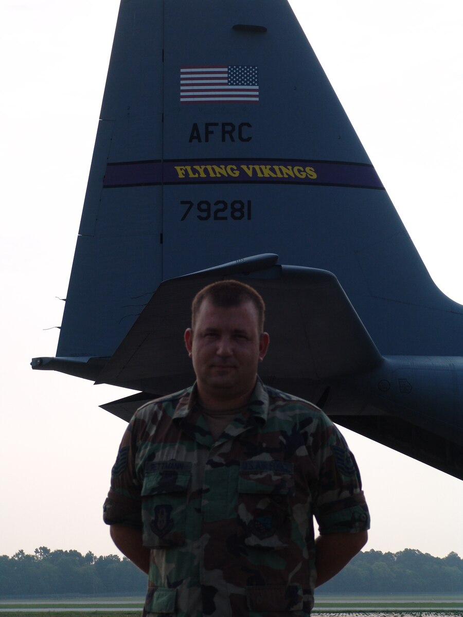 Tech. Sgt. Ben Rettman, 934th Aircraft Maintenance Squadron crew chief, Minneapolis-St. Paul International Airport Air Reserve Station, Minn., with the distinctive tail of the unit's "Flying Vikings" C-130 in the background, at the Augusta Regional Airport - Bush Field, Ga., in support of the Golden Medic Exercise 2007.